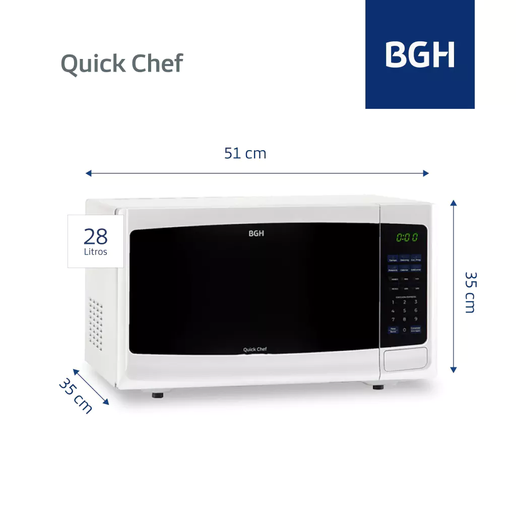 El Microondas BGH Digital 28 Litros 900W B228DB9 es una excelente opción para quienes buscan un electrodoméstico eficiente y de gran capacidad. Con 28L de capacidad y funciones avanzadas como grill, cocción en etapas y descongelado por peso, este microondas se adapta a tus necesidades diarias. Su diseño elegante en blanco y su potencia de 900W lo hacen ideal para todo tipo de preparaciones.